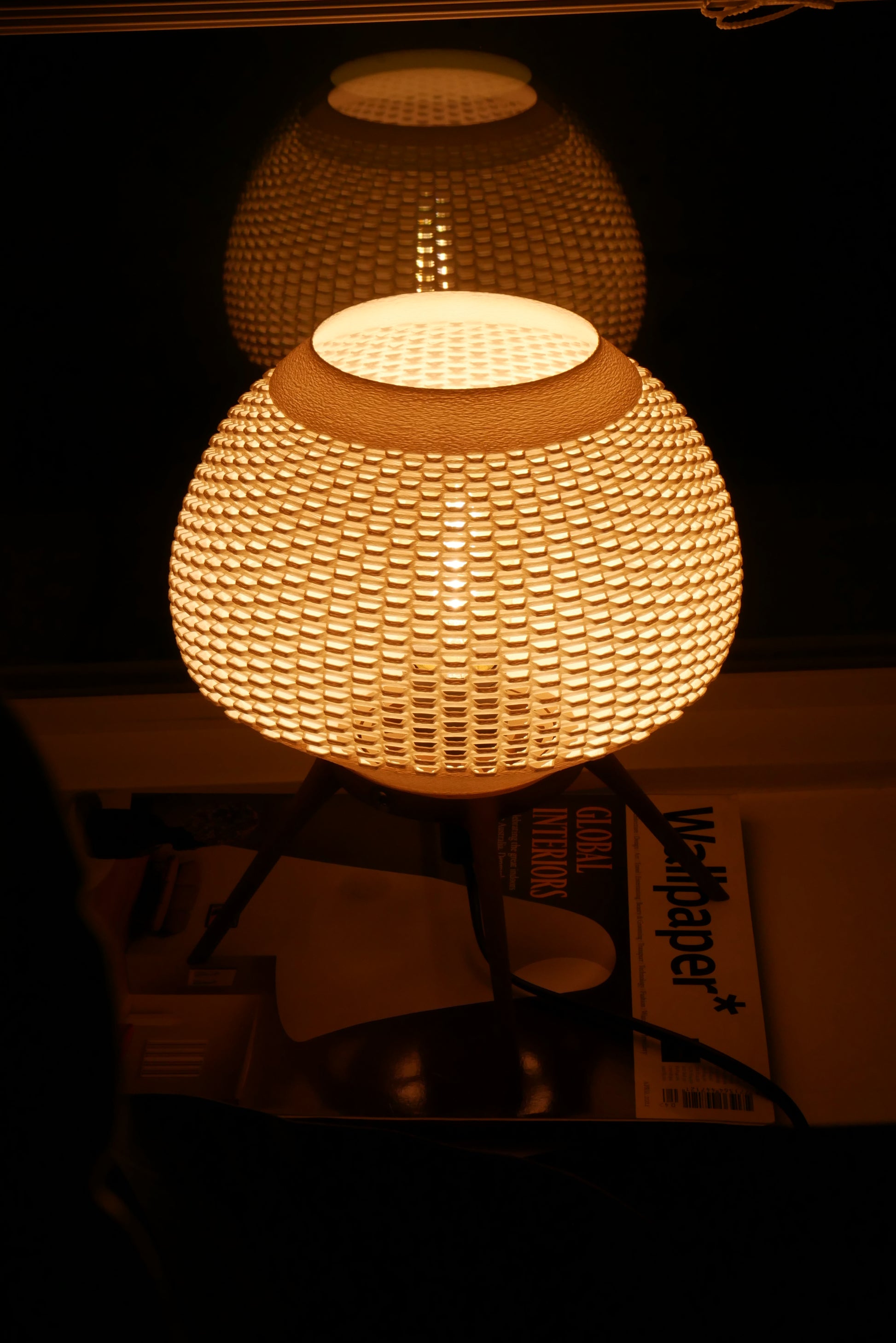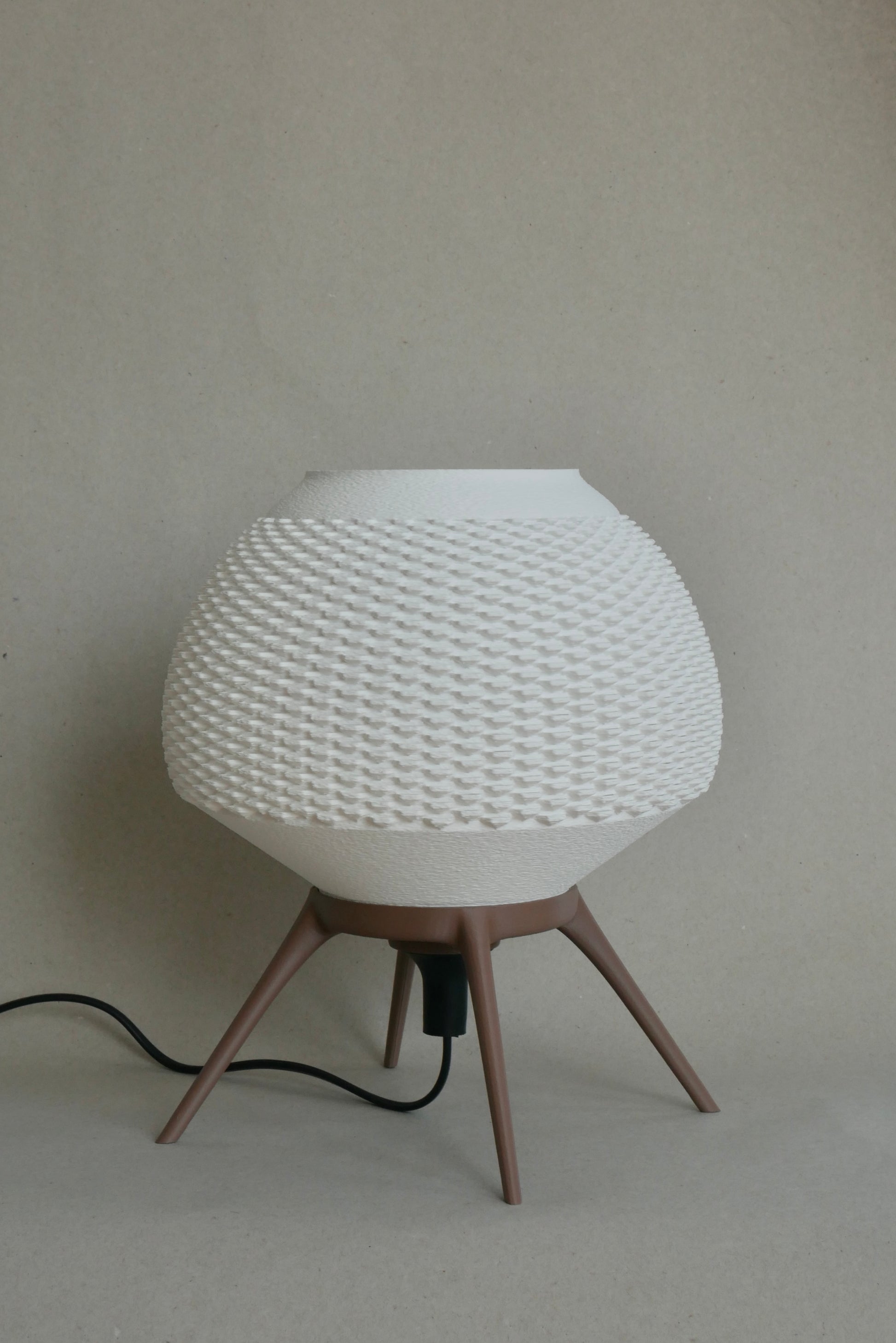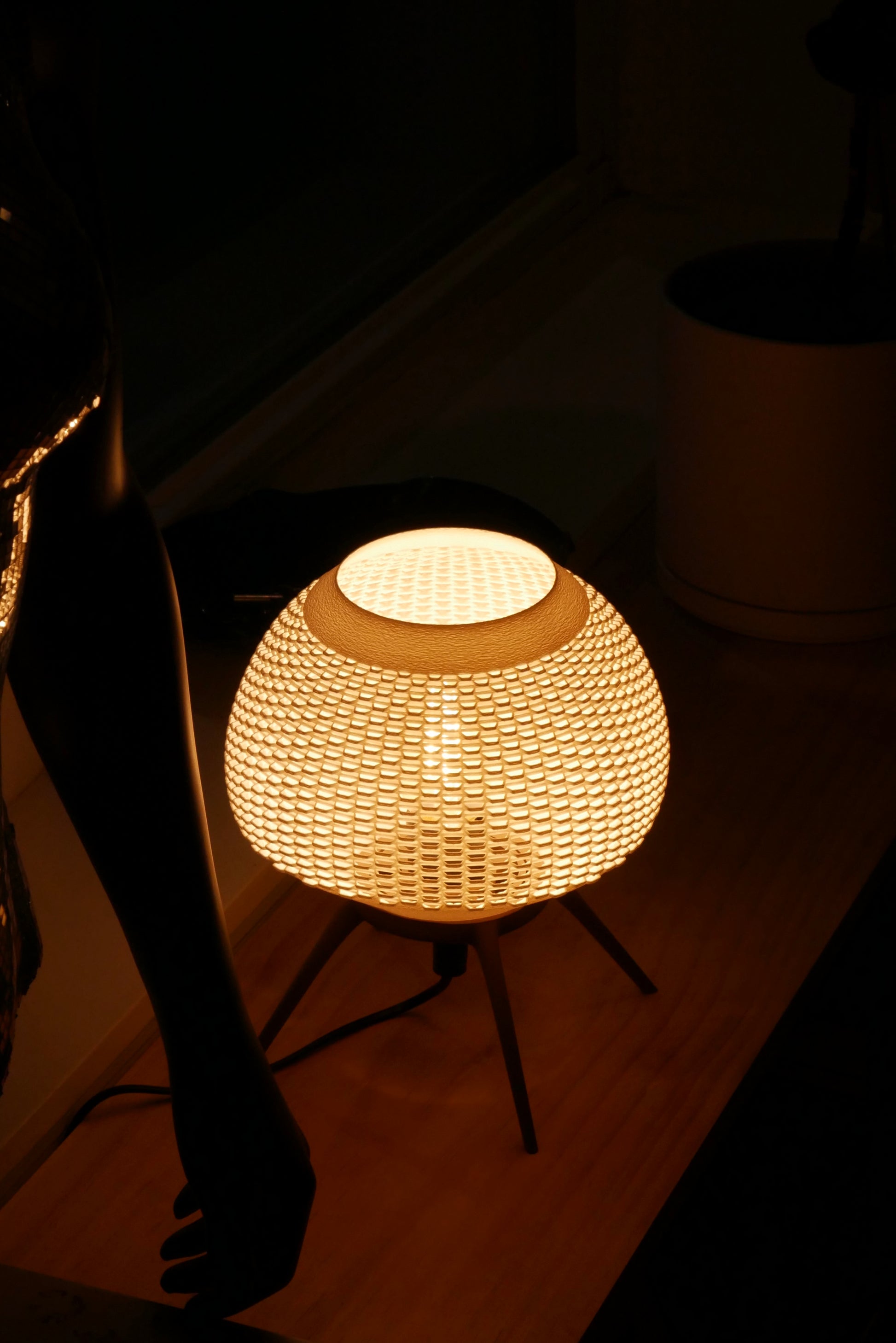 OMRA is a sculptural table lamp built around a 3D printed woven shell. The open geometric structure allows soft light to leak through each segment, creating a warm ambient glow that shifts with the room.